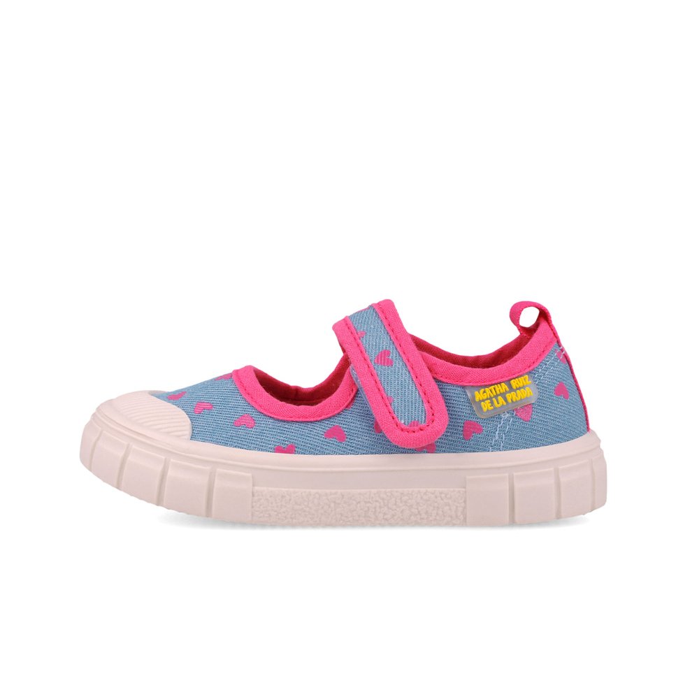 AGATHA RUIZ DE LA PRADA barefoot shoes in denim color with pink hearts. Made of textile with natural toxic-free materials. With a wide and reinforced toe so that your feet are perfectly protected while enjoying maximum freedom of movement. Respectful children’s footwear that take into account the natural development of the foot.Features: